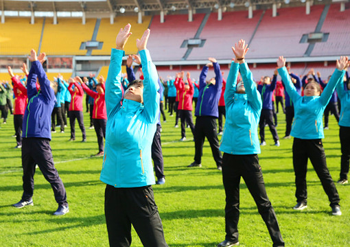 职工工间操展示,伴随着青春的旋律,他们动作整齐划一、协调舒展,充分展现了首都工会职工良好的精神面貌。
