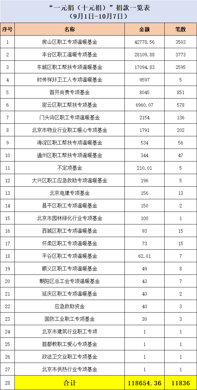 【十一 一元捐(十元捐)】 已收到1.18万名首都爱心职工捐款11.87万元