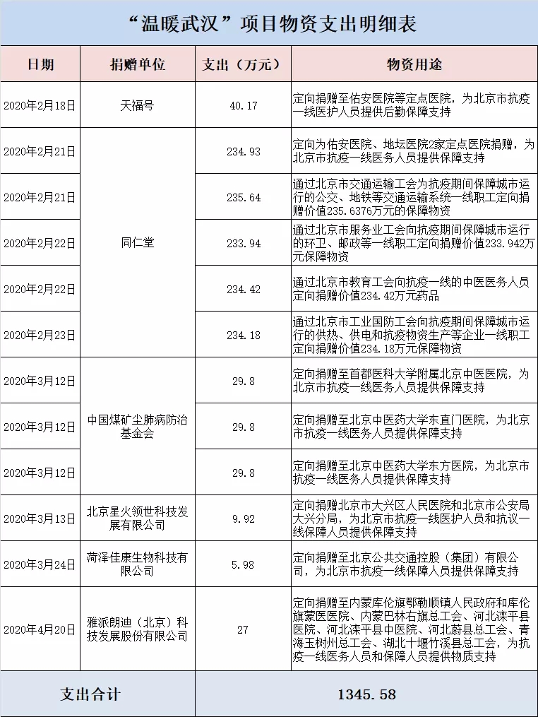 截止2021年10月底,市温暖基金会已完成资金支出4200.62万元(现金支出2855.04万元,实物价值1345.58万元)。用于慰问武汉市47家定点医院和湖北省11市的医护人员、公安干警、保安员等共计3.4万人;慰问北京市3家定点医院、108个发热门诊,首都1500多名援鄂医护人员及抗疫保障一线环卫职工、一线护理工、保安职工、社区工作者等。