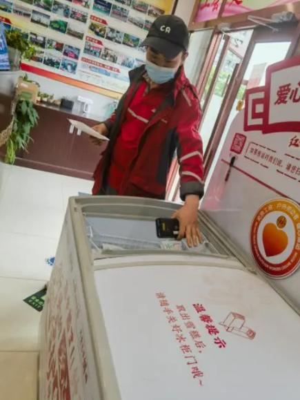 仔细看小杜身后的冰柜,冰柜后方粘着一幅宣传板,上方印着“爱心冰柜 雪糕自取”的红色大字,冰柜的柜门上方还提示着“取出雪糕后,请随手关好冰箱门哦”。