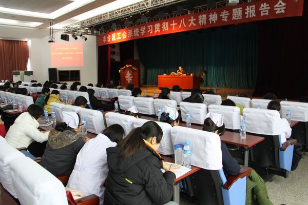 12月14日,丰台区工会系统学习贯彻十八大精神专题报告会在丰台工人俱乐部举行,来自丰台区在职劳动模范、工会干部、各行各业职工代表300多人参加了会议。