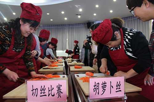 比赛活动以弘扬中国传统饮食文化,展示才艺技能,营造快乐生活、快乐工作为目的,本着重在参与、娱乐为主的原则进行,得到了机关广大女工的积极响应。在厨师展示完刀功后,镇党委书记带头拿起刀具,投入到比赛活动中,现场气氛立即热烈起来。女工们纷纷使出看家本领,只见她们刀法娴熟,精心摆放,不一会儿,用胡萝卜、土豆、黄瓜等食材切出的造型各异的丝、片、块便一一呈现在大家眼前,引得现场观众连连称赞。比赛还专程请来了“妇女之友”做评委,他们从刀功、速度等方面进行现场打分评判,最终评出了优胜者。