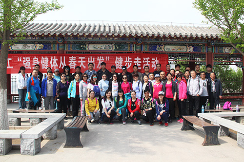 10点左右,职工们相继登上了森林公园的最高峰,在花园式的观景台中,大家兴奋地四下眺望,将处处美景尽收眼底。在古色古香的长廊映衬下,“花乡职工强身健体从春天出发健步走活动”的红色横幅鲜艳夺目,大家绽放笑脸,纷纷在这里合影留念。
