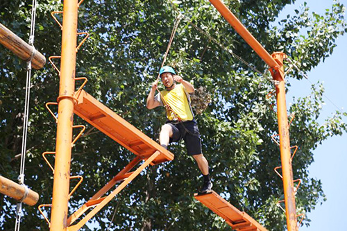 为了消除队员之间的生疏感,增进队员之间的情感,在教练的引领下,全体队员围成圆圈,做好准备活动。随后,队员分为4只队伍,分别推选出队长、队秘和护旗手,完成了包括高空断桥、沙场点兵、“水上大冲关”、“水上竞速”等考验胆量、平衡力和团队配合协作能力的拓展培训项目。