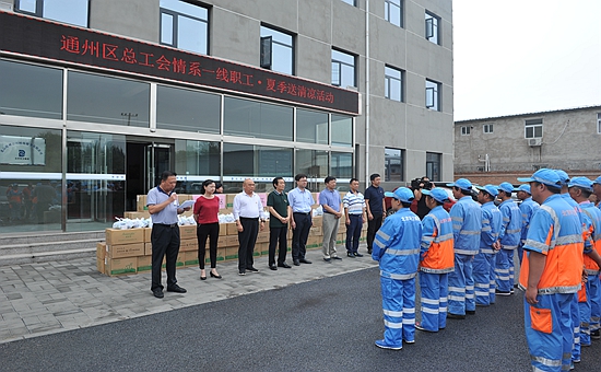 时值盛夏酷暑季节,7月3日上午,通州区总工会党组书记、常务副主席关平带领区总工会职工服务中心相关工作人员,来到通州文化旅游区、通州京环环境服务有限公司、通州区交通支队,开展“情系一线职工夏季送清凉慰问活动”,为在高温下奋战的建筑、环卫工人及执勤民警,送去了绿豆、白糖、清凉饮品及洗护用品等价值30余万元的防暑降温物品。