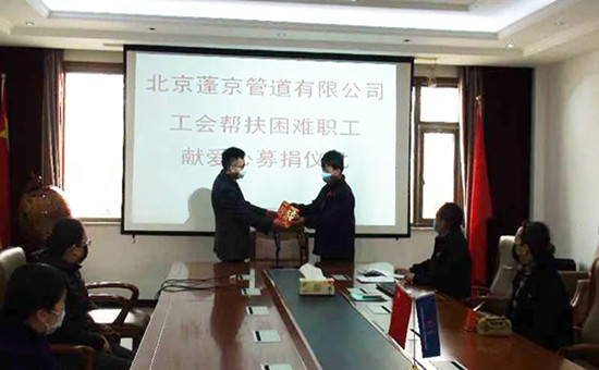 职工潘刚是公司一名生产职工,2019年11月其爱人生重病经历了一场手术,且爱人的病后续几年还有手术治疗需要,家中还有三个孩子上学,彼时只能靠他一人工资养家,因此导致职工家庭生活困难。北京蓬京管道有限公司工会了解到此情况之后,向全公司发出向潘刚同志献爱心倡议活动,得到企业职工的大力响应,公司共筹集爱心捐赠人民币13880元,其中工会捐赠5000元,职工捐赠8880元。捐赠仪式上公司工会主席将爱心善款送到职工手中,表达了企业对困难职工的关心和温暖。