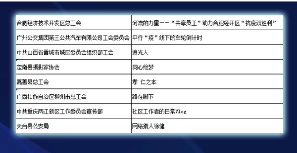 由中华全国总工会、中央网信办主办,天津市总工会承办的“网聚职工正能量 争做中国好网民”——网络正能量微视频征集活动于2020年5月全面启动,8月31日截止报名,共计收到来自全国29个省市自治区、产业行业工会及大型央企的作品1600余部,参赛作品数量同比增加50%。