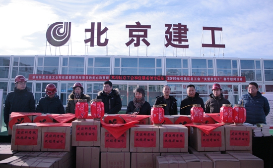 用这些充满春节喜庆气氛的慰问品把党和政府的关心关爱送给为怀柔科学城建设做出贡献的建设者们。同时也将这份祝福带给工友家人和亲朋好友,给他们拜年让大家一同